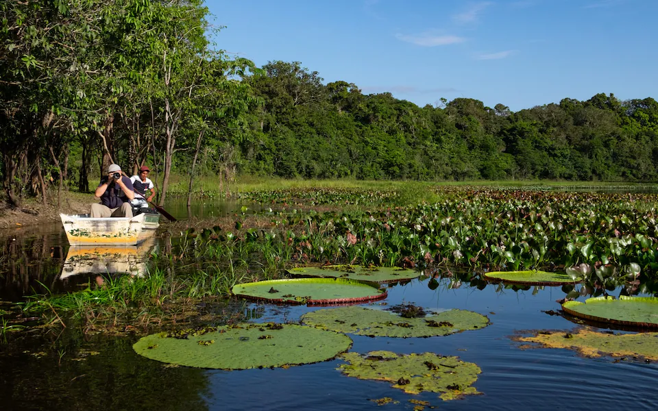 A nearby pool, popular with catch-and-release anglers, contains the world’s highest number of arapaima: an enormous freshwater fish that is able to live for 24 hours out of water. Paddle along the river, through lily pads the size of dinner plates, and look for bubbles on the surface.